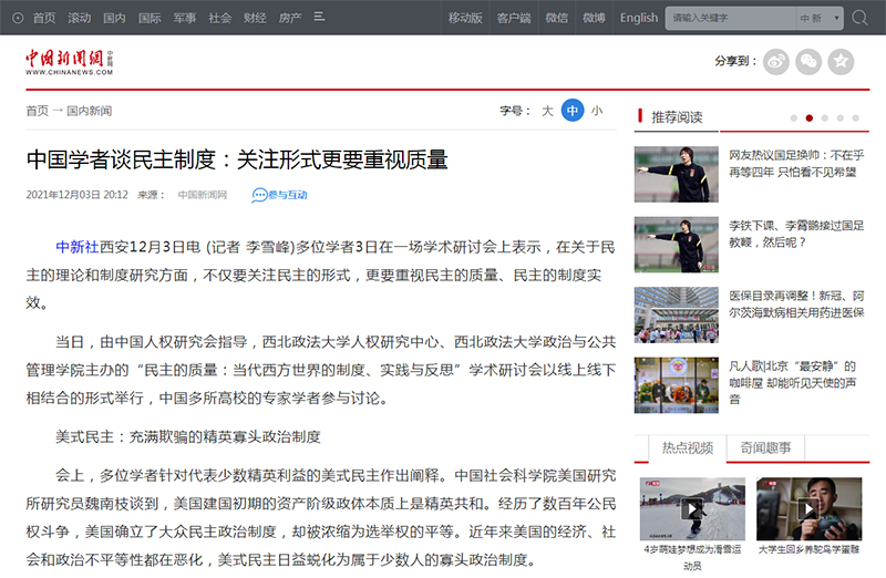 中新社西安12月3日电 (记者 李雪峰)多位学者3日在一场学术研讨会上表示,在关于民主的理论和制度研究方面,不仅要关注民主的形式,更要重视民主的质量、民主的制度实效。