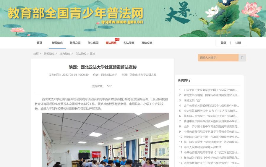 西北政法大学赴山阳暑期社会实践专项团队来到丰西新城社区进行禁毒普法宣传活动。山阳县科技和教育体育局领导高度重视本次暑期社会实践工作,委派基教股张慧敏老师、山阳县九一小学王立宏副校长、城关九年制学校蔡俊柱副校长带领团队开展活动。