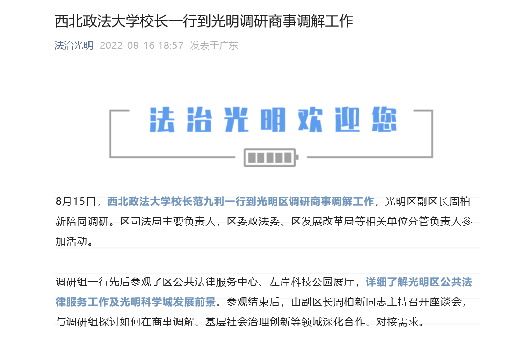 8月15日,西北政法大学校长范九利一行到光明区调研商事调解工作,光明区副区长周柏新陪同调研。区司法局主要负责人,区委政法委、区发展改革局等相关单位分管负责人参加活动。