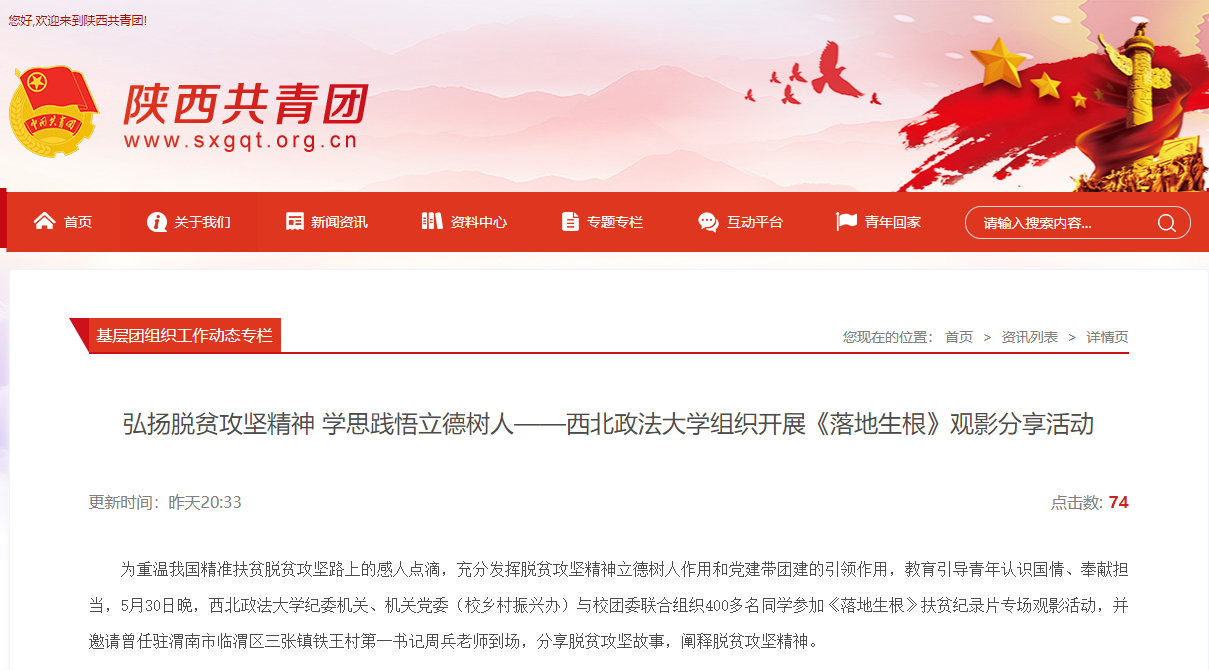 为重温我国精准扶贫脱贫攻坚路上的感人点滴,充分发挥脱贫攻坚精神立德树人作用和党建带团建的引领作用,教育引导青年认识国情、奉献担当,5月30日晚,西北政法大学纪委机关、机关党委(校乡村振兴办)与校团委联合组织400多名同学参加《落地生根》扶贫纪录片专场观影活动,并邀请曾任驻渭南市临渭区三张镇铁王村第一书记周兵老师到场,分享脱贫攻坚故事,阐释脱贫攻坚精神。