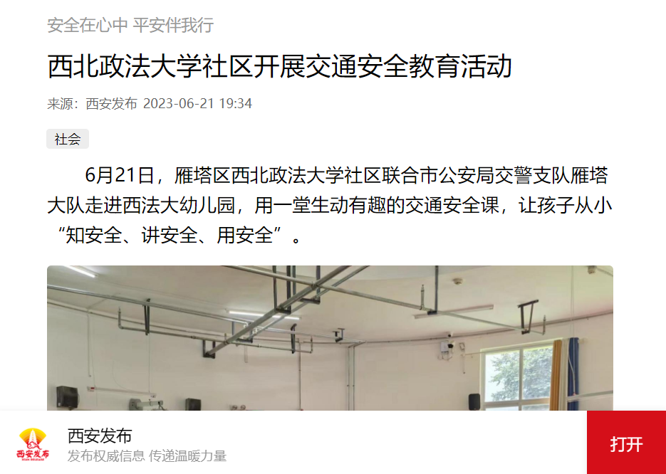 6月21日,雁塔区西北政法大学社区联合市公安局交警支队雁塔大队走进西法大幼儿园,用一堂生动有趣的交通安全课,让孩子从小“知安全、讲安全、用安全”。