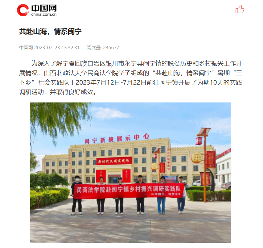 为深入了解宁夏回族自治区银川市永宁县闽宁镇的脱贫历史和乡村振兴工作开展情况,由西北政法大学民商法学院学子组成的“共赴山海,情系闽宁”暑期“三下乡”社会实践队于2023年7月12日-7月22日前往闽宁镇开展了为期10天的实践调研活动,并取得良好成效。