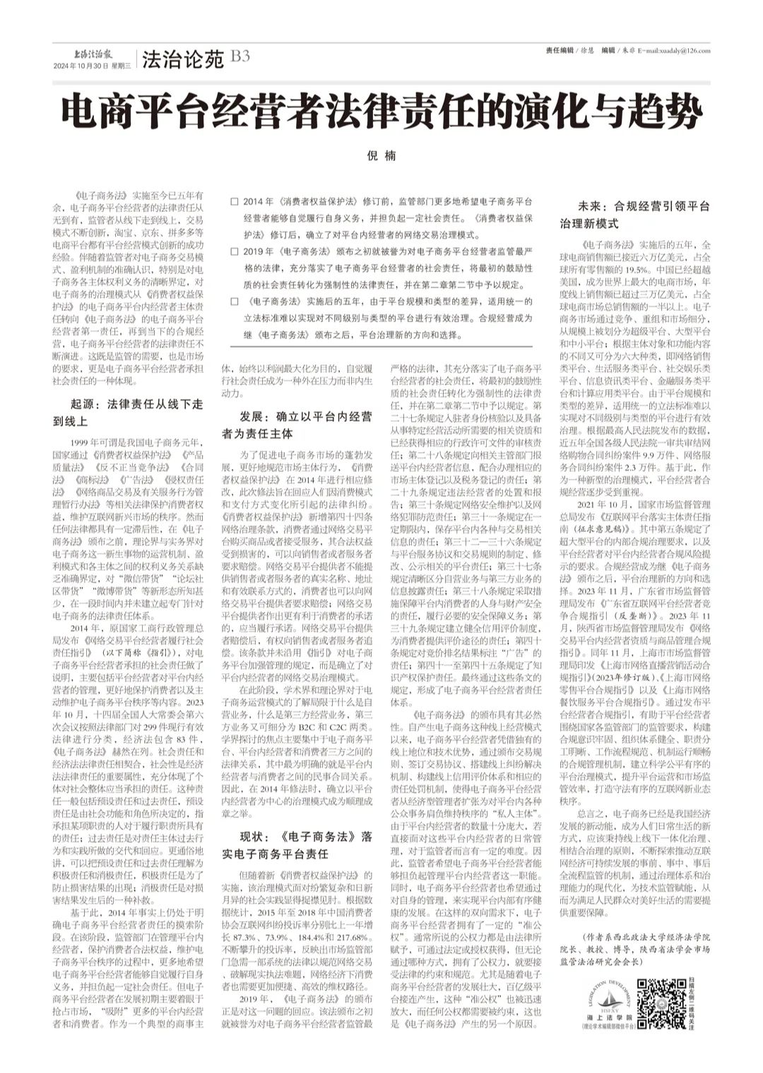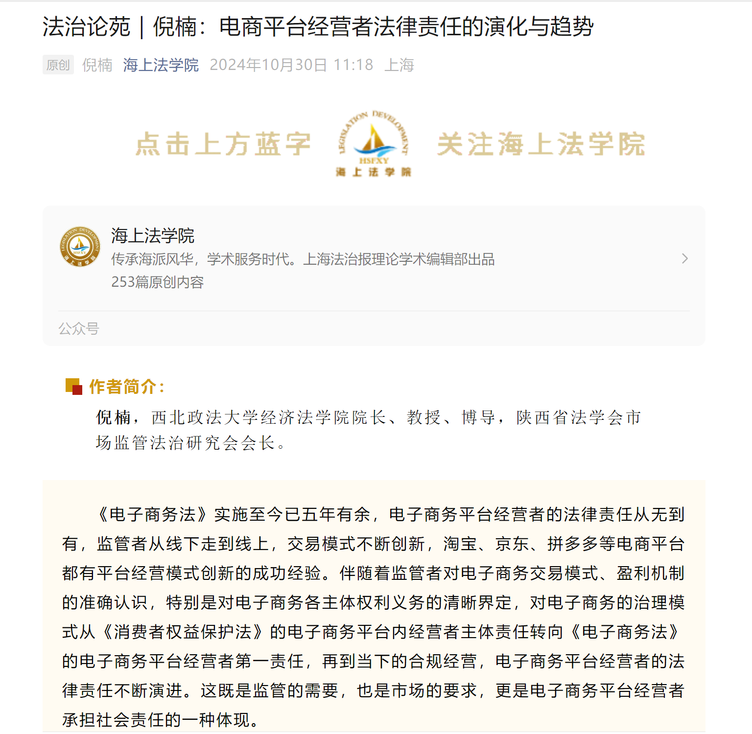 【海上法学院】法治论苑|倪楠:电商平台经营者法律责任的演化与趋势https://mp.weixin.qq.com/s/C4gqNc14WUEr4vwIlWM4Ng