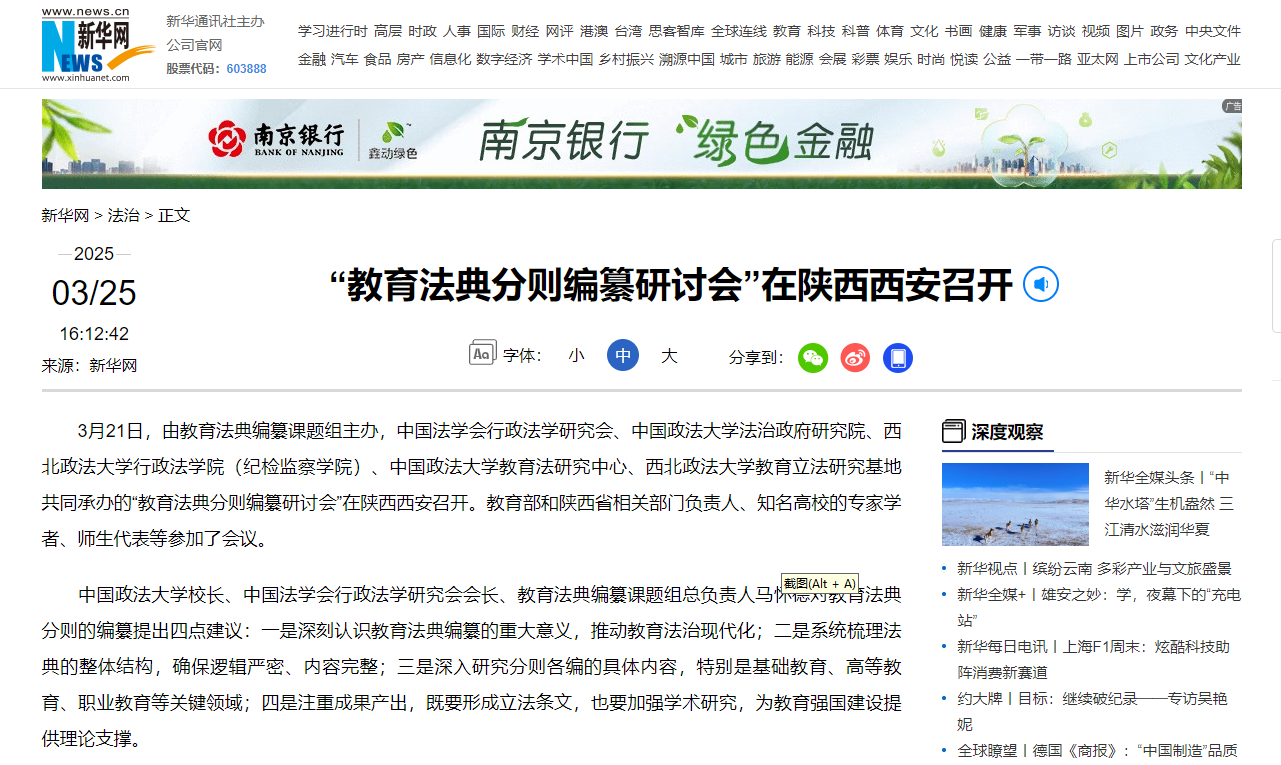 【新华网】“教育法典分则编纂研讨会”在陕西西安召开 https://www.news.cn/legal/20250325/d6f2ceee7ab74bab96fc6b592a71d075/c.html