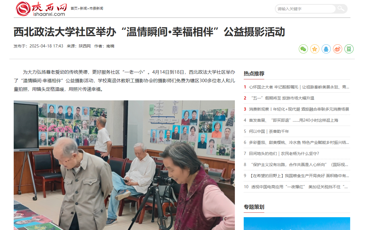 【陕西网】西北政法大学社区举办“温情瞬间·幸福相伴”公益摄影活动 https://www.ishaanxi.com/c/2025/0418/3403952.shtml