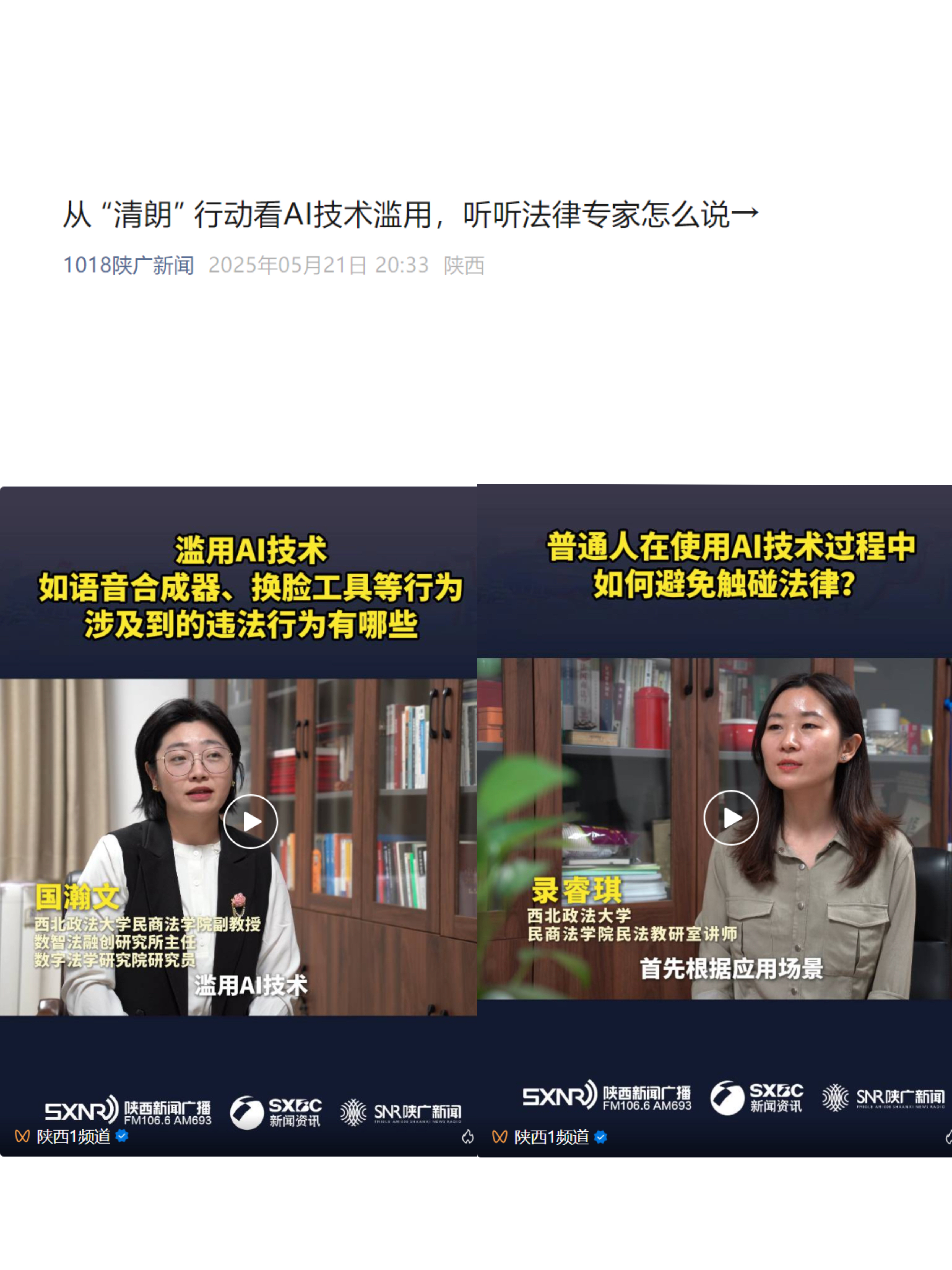【陕西新闻广播】从 “清朗” 行动看AI技术滥用,听听法律专家怎么说→:https://mp.weixin.qq.com/s/3uJPEt7s_ohps-CVnqqGfA