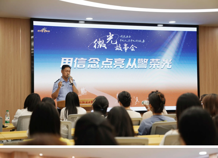 当大屏幕播放“中国好人”、陕西省道德模范王排的微光视频时,会场瞬间安静。“我工作的第十个年头,被嫌疑人一刀扎进了肺部……像类似的事情一次接一次,我的心里渐渐对自己的工作有了新的认识:不穿警服,你是被保护者;但穿上这一身警服,你就是保护者。”王排讲述到,自己作为一名民警,身上留下的一道道疤痕,都是守护人民平安的荣誉勋章。从警20余年参与处置百余起案件的他,用朴实话语诠释《用信念点亮从警荣光》的主题,台下师生用持续掌声向这位守护者致敬。