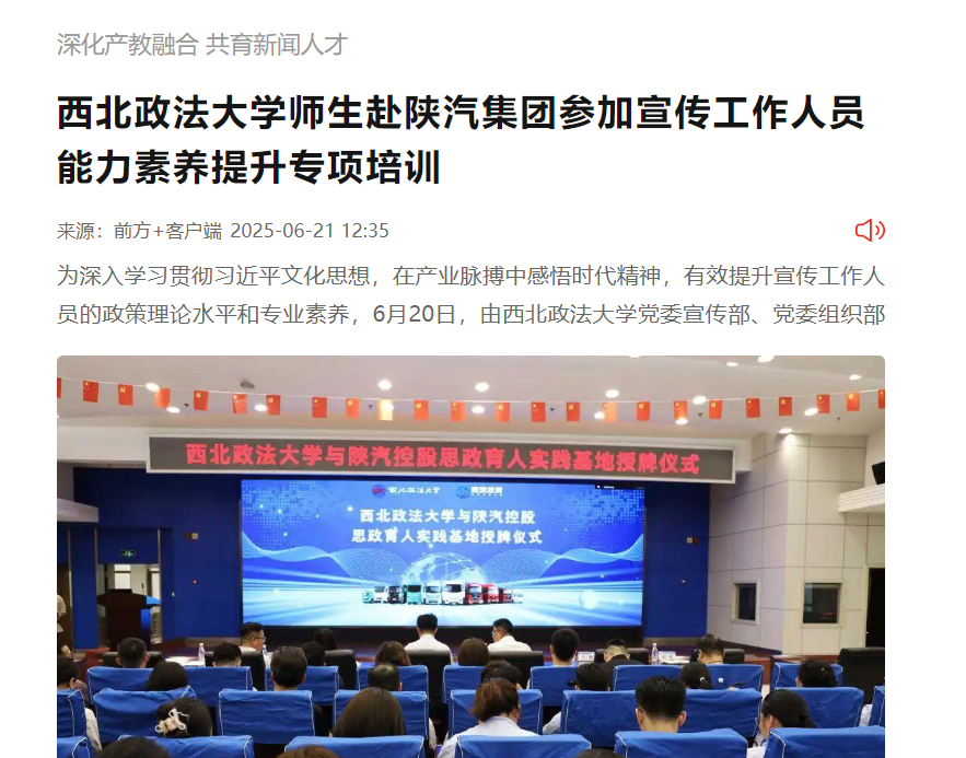 【前方+客户端】西北政法大学师生赴陕汽集团参加宣传能力素养提升专项培训 https://qfapp.xiancn.com/app/template/displayTemplate/news/newsDetail/51771/7153522.html?isShare=true&xyt=1750481864944
