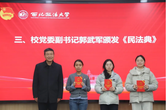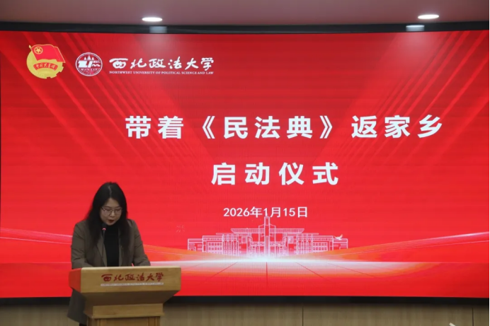 以法治为翼,赴家乡之约;以青春之力,筑基层之基。在《民法典》颁布五周年的重要节点,为深入学习贯彻习近平法治思想,积极响应司法部、教育部、共青团中央“法援志愿行”活动号召,紧密对接2026年全国大学生“返家乡”社会实践部署,1月15日下午,我校在长安校区“一站式”学生成长发展中心隆重举行2026年“带着《民法典》返家乡”社会实践暨“法援志愿行”专项活动启动仪式。校党委副书记郭武军出席活动,校团委、民商法学院相关负责人作为单位代表参加活动,陕西省大学生法治宣讲团各分团指导教师、校团委全体干部及省大学生法治宣讲团、各校级生组织、法律服务中心学生代表共同参会,启动仪式由校团委副书记王洋主持。