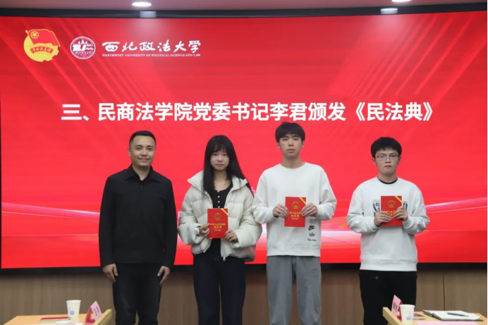庄重的授书仪式环节,校党委副书记郭武军、民商法学院党委书记李君共同为“返家乡”普法宣讲与法律援助志愿服务队学生代表颁发《民法典》。一本本厚重的法典,承载着学校的殷切期望,更传递着法治传承的责任与使命,标志着学子们即将以法律为武器,奔赴基层法治实践的广阔天地。