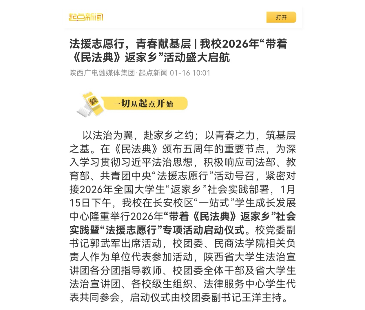 【起点新闻】法援志愿行,青春献基层 | 我校2026年“带着《民法典》返家乡”活动盛大启航