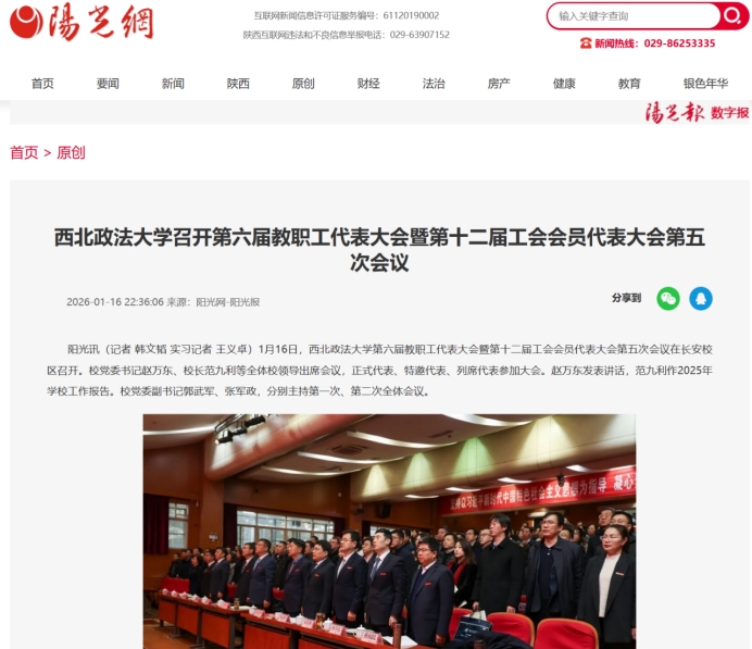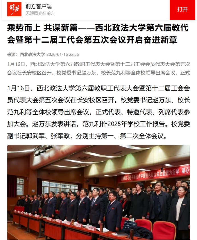 1月16日,西北政法大学第六届教职工代表大会暨第十二届工会会员代表大会第五次会议在长安校区召开。校党委书记赵万东、校长范九利等全体校领导出席会议,正式代表、特邀代表、列席代表参加大会。赵万东发表讲话,范九利作2025年学校工作报告。校党委副书记郭武军、张军政,分别主持第一次、第二次全体会议。