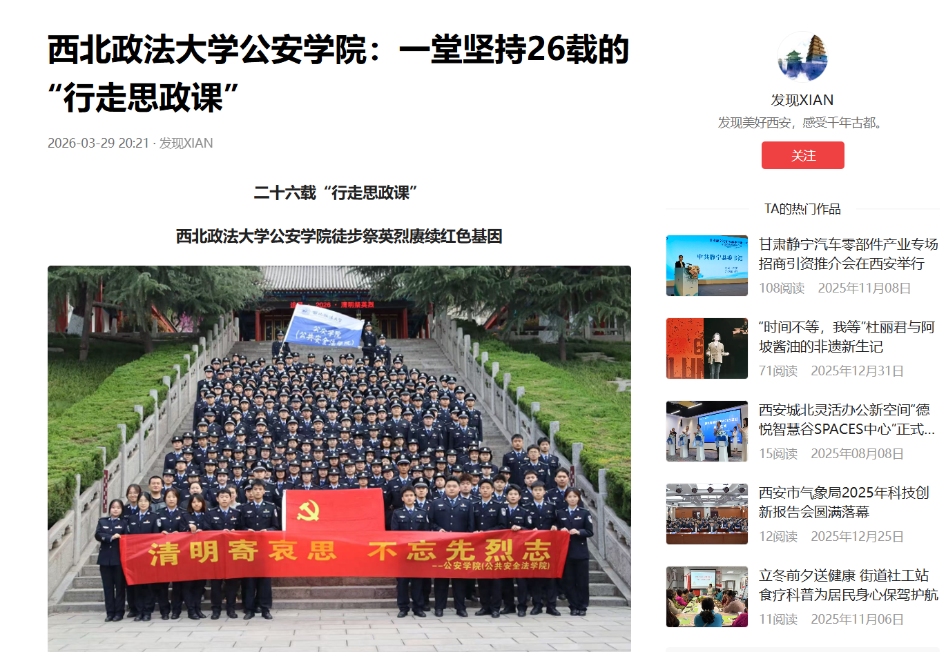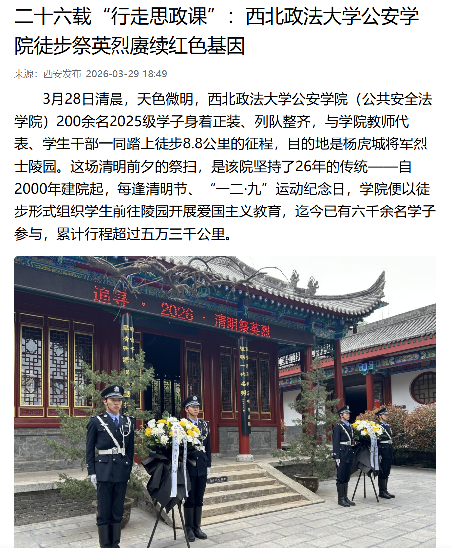 3月28日清晨,天色微明,西北政法大学公安学院(公共安全法学院)200余名2025级学子身着正装、列队整齐,与学院教师代表、学生干部一同踏上徒步8.8公里的征程,目的地是杨虎城将军烈士陵园。这场清明前夕的祭扫,是该院坚持了26年的传统——自2000年建院起,每逢清明节、“一二·九”运动纪念日,学院便以徒步形式组织学生前往陵园开展爱国主义教育,迄今已有六千余名学子参与,累计行程超过五万三千公里。
