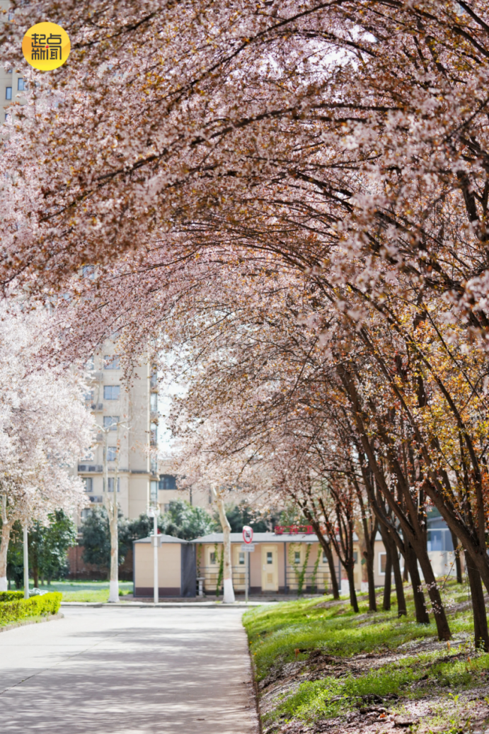 道路两旁繁花如云,层层叠叠的花枝交织成浪漫花廊,漫步其间,仿佛闯入春日的梦幻秘境。