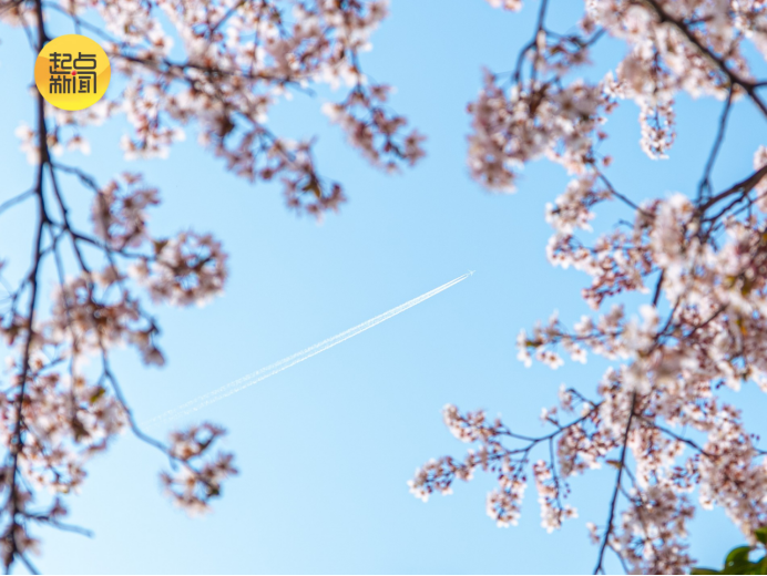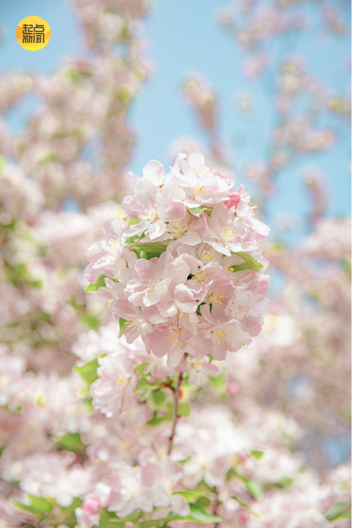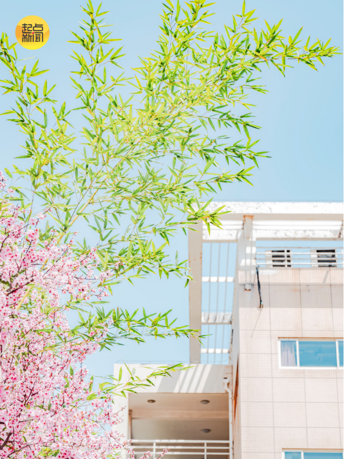 新绿枝叶舒展,粉花点缀其间,在澄澈蓝天的映衬下,勾勒出清新治愈的春日景致。