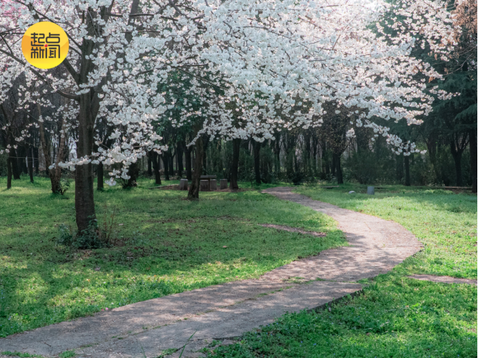 林间小径蜿蜒,洁白繁花如云似雪,铺展成一片静谧唯美的春日花海。