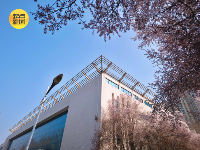 楼宇旁花枝摇曳,淡紫繁花与蓝天相映,为春日增添一抹温柔诗意。