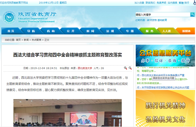近期,西北政法大学党委把学习贯彻党的十九届四中全会精神作为一项重大政治任务,与主题教育紧密结合,推动主题教育不断深化。聚焦查找的问题和不足,结合专项整治和巡视反馈意见,结合年度目标任务,凝心聚力狠抓整改落实,确保主题教育见实效、见长效。