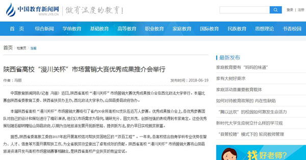 中国教育新闻网讯(记者 冯丽) 近日,陕西省高校“漫川关杯”市场营销大赛优秀成果推介会在西北政法大学举行。本届比赛由陕西省委教育工委、陕西省扶贫办主办,西北政法大学承办,山阳县委县政府协办。