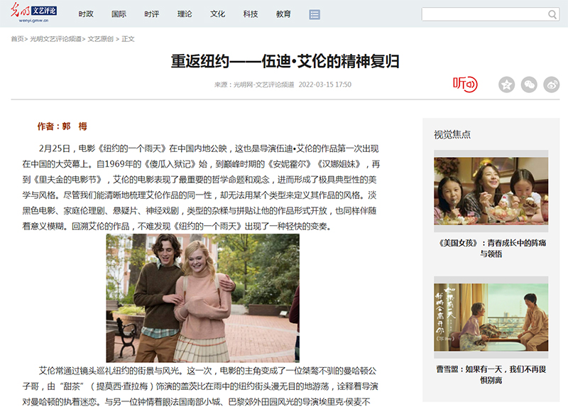 2月25日,电影《纽约的一个雨天》在中国内地公映,这也是导演伍迪•艾伦的作品第一次出现在中国的大荧幕上。自1969年的《傻瓜入狱记》始,到巅峰时期的《安妮霍尔》《汉娜姐妹》,再到《里夫金的电影节》,艾伦的电影表现了最重要的哲学命题和观念,进而形成了极具典型性的美学与风格。尽管我们能清晰地梳理艾伦作品的同一性,却无法用某个类型来定义其作品的风格。淡黑色电影、家庭伦理剧、悬疑片、神经戏剧,类型的杂糅与拼贴让他的作品形式开放,也同样伴随着意义模糊。回溯艾伦的作品,不难发现《纽约的一个雨天》出现了一种轻快的变奏。
