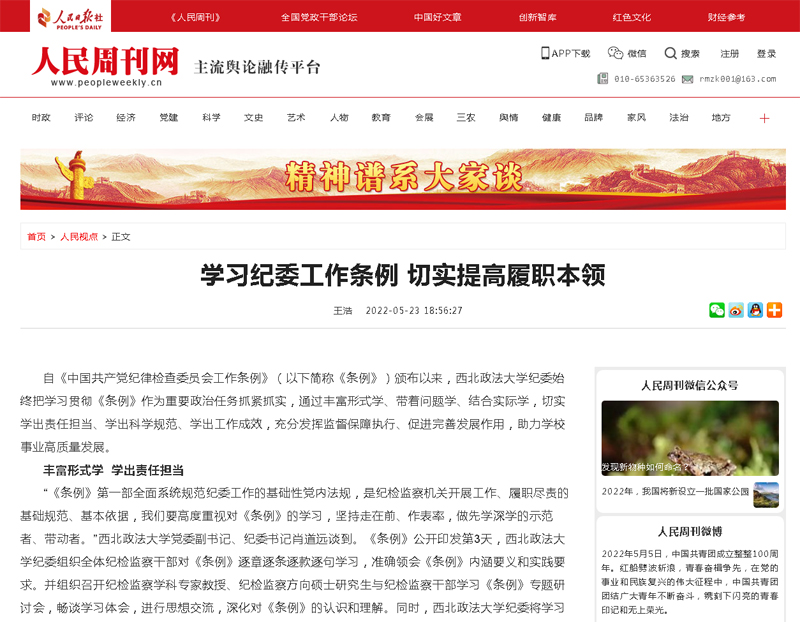 西北政法大学纪委副书记康鹏谈到,我们始终坚守“监督的再监督”职能定位,心怀“国之大者”,加强政治监督,做实日常监督,确保了党中央重大决策部署落地落实。西北政法大学纪委始终把推动工作、解决问题作为检验学习贯彻《条例》成效的依据。针对新一轮奥密克戎新冠疫情防控,西北政法大学纪委及时修订疫情防控工作监督方案,深入一线开展监督检查,形成监督检查记录和报告20余份,下发监督检查建议5份,推动校内各级党组织和党员干部守土有责、守土尽责,确保了学校内部零感染无确诊。根据《条例》中关于加强新时代廉洁文化建设的有关要求,西北政法大学纪委深入挖掘学校优秀廉洁文化教育资源,组织在校学生自编自演,推出话剧《汉吏张汤》《庄严审判》等廉洁文化作品,在学校进行公演,引导青年学生坚定理想信念,严守纪法规矩,扣好廉洁的“第一粒扣子”。西北政法大学纪委充分发挥学校廉政文化研究中心作用,将廉洁文化建设和人才培养相结合,积极推动纪检监察学一级学科建设,多次召开专家学者座谈会,对学科建设进行可行性分析论证,为申报纪检监察学一级学科打好基础。(西北政法大学纪律检查委员会)