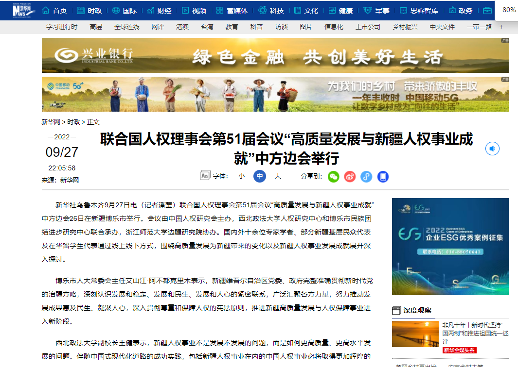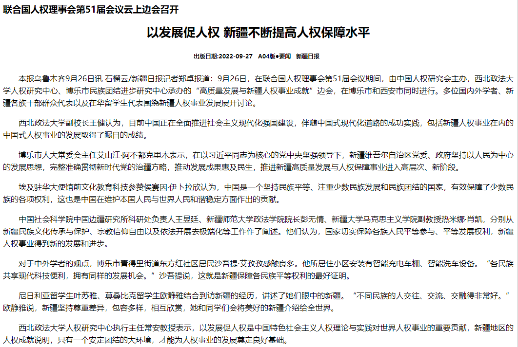 本报乌鲁木齐9月26日讯 石榴云/新疆日报记者郑卓报道:9月26日,在联合国人权理事会第51届会议期间,由中国人权研究会主办,西北政法大学人权研究中心、博乐市民族团结进步研究中心承办的“高质量发展与新疆人权事业成就”边会,在博乐市和西安市同时进行。多位国内外学者、新疆各族干部群众代表以及在华留学生代表围绕新疆人权事业发展展开讨论。