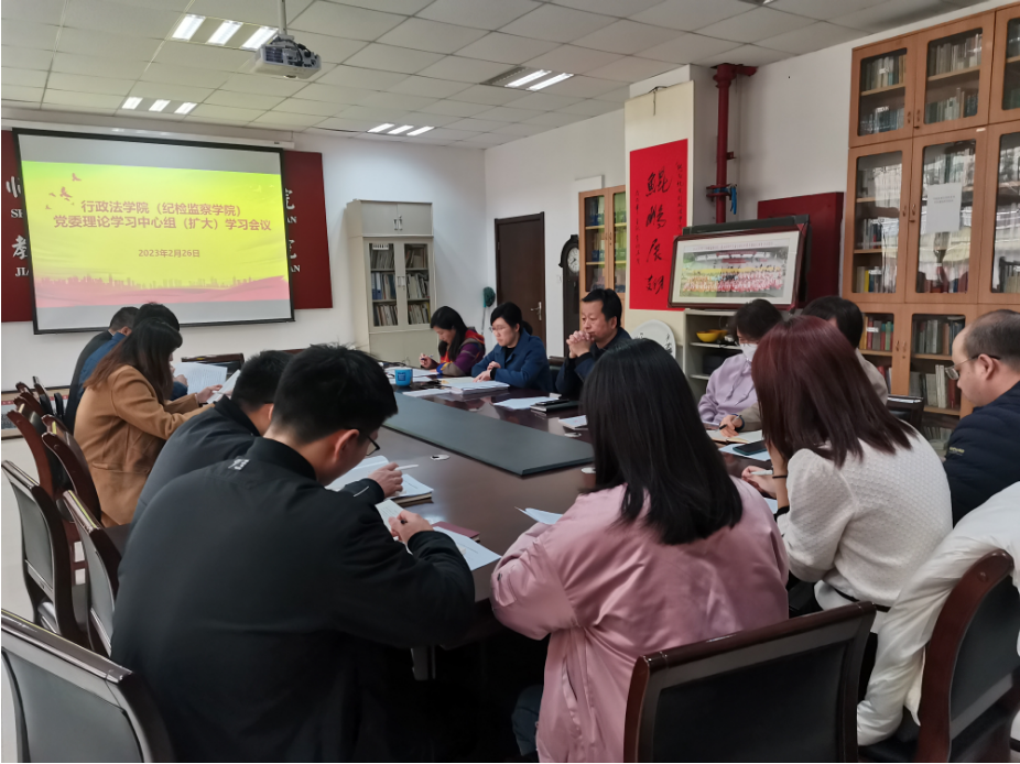 2月26日下午,行政法学院(纪检监察学院)在学院资料室召开党委理论学习中心组(扩大)会议。学院班子成员、党委委员、党支部书记、科级干部及全体辅导员参加学习。学院党委书记赵玎玎主持会议。