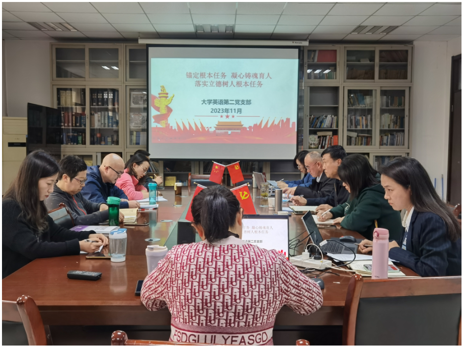11月22日下午,外国语学院大学英语第二党支部在学院资料室召开理论学习会议,校党委副书记郭武军到会指导并讲授专题党课。学院党委副书记刘瑾和支部全体党员参加会议,会议由支部书记郭佳主持。