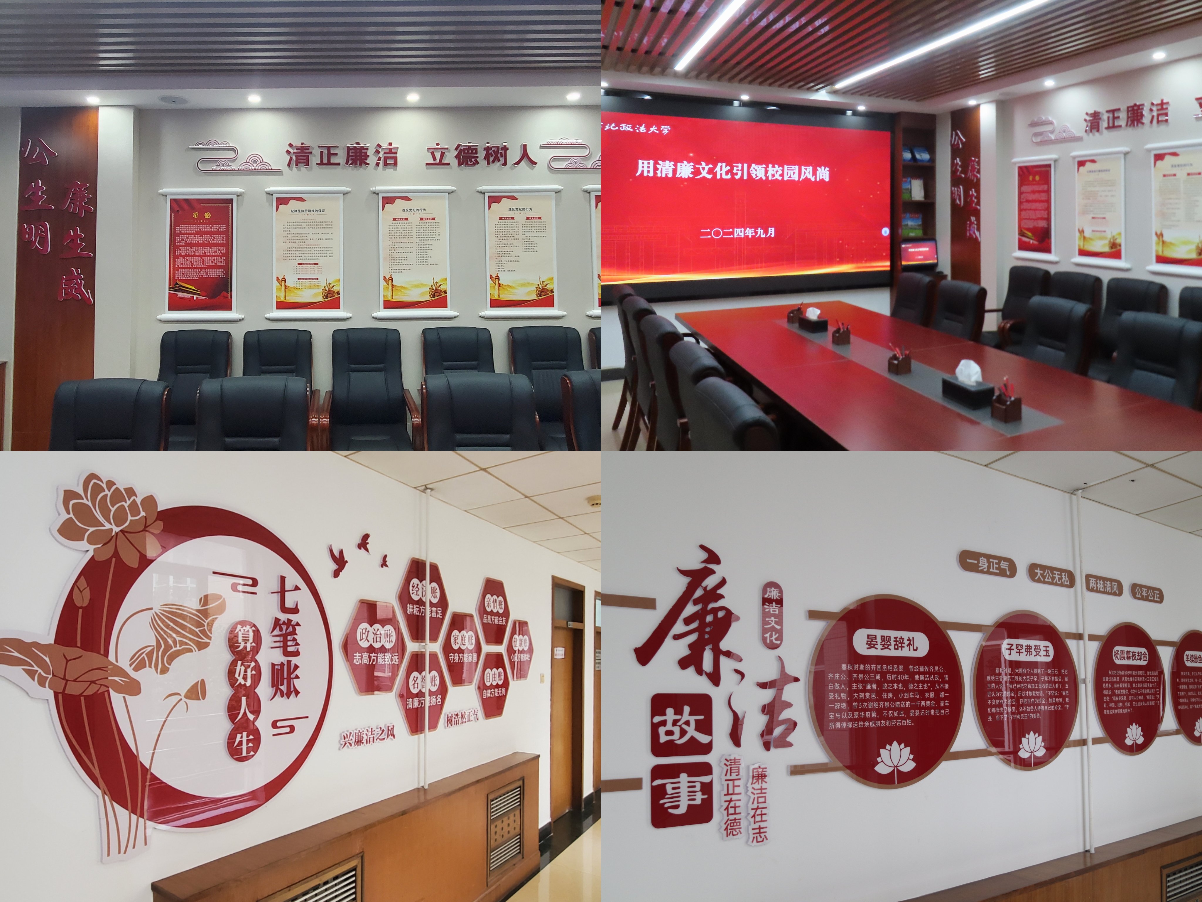 廉洁教育活动室位于校务楼A座215室,由活动室和文化墙组成,充分融入红色文化、传统文化中的廉洁文化元素,整体风格庄重严肃,并以电子屏幕、图文展板相结合的方式,营造了崇廉尚廉的浓厚氛围。