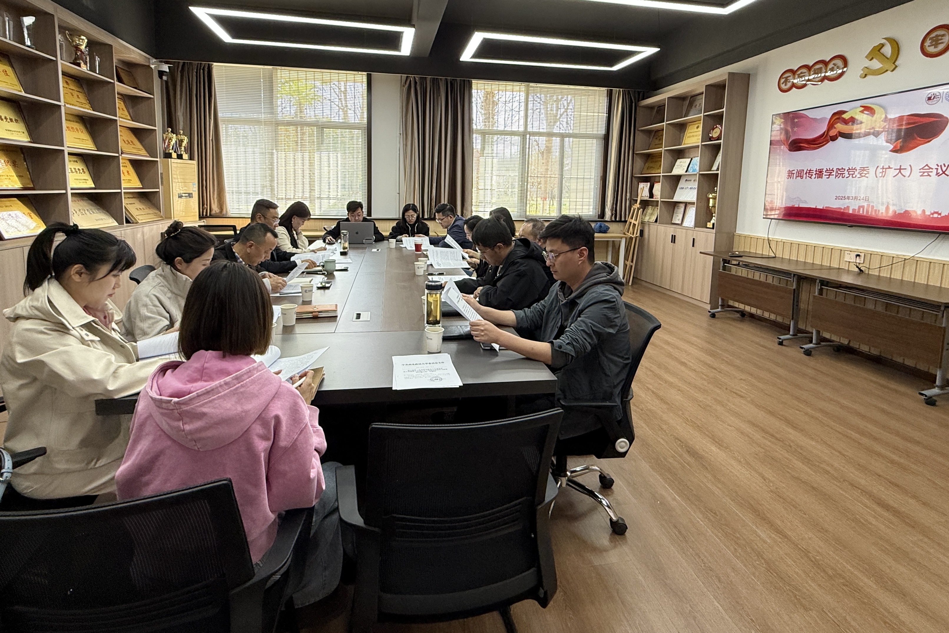 3月24日,新闻传播学院召开党委会(扩大)会议,集体学习了习近平总书记关于深入贯彻中央八项规定精神学习教育的重要讲话和重要指示精神,以及中央八项规定及其实施细则精神,传达学习中央及省委关于开展深入贯彻中央八项规定精神学习教育的有关精神,《中共西北政法大学委员会关于开展深入贯彻中央八项规定精神学习教育的实施方案》和学校3月20日党委会(扩大)会议要求。对学院下一步开展深入贯彻中央八项规定精神学习教育进行研究部署。学院领导班子成员、党委委员、科级干部、各党支部书记参加会议。