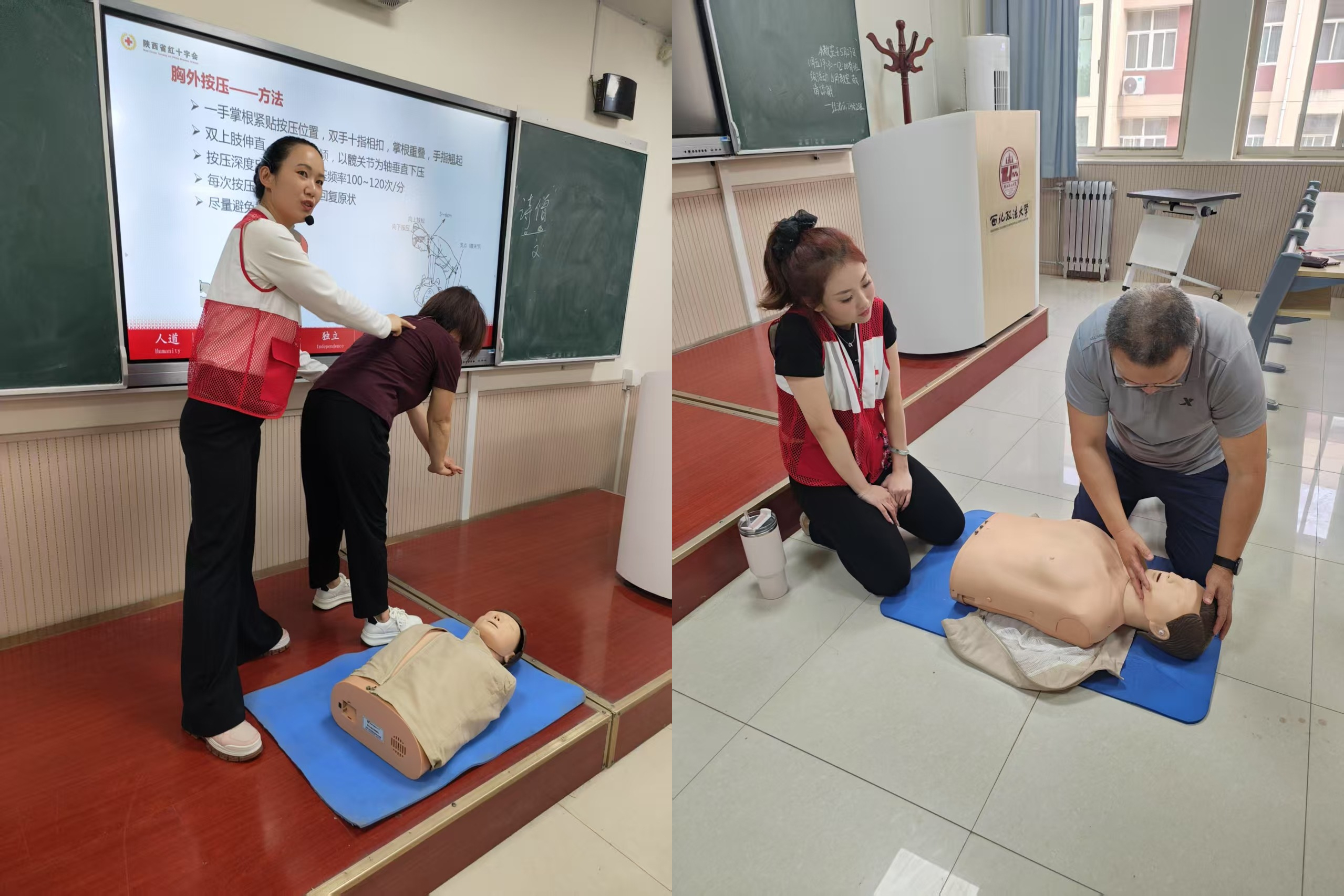 5月22日下午,由陕西省红十字会和校门诊部共同举办的“心肺复苏”急救技能培训活动在长安校区举行。本次活动邀请到陕西省红十字会应急救护培训师何婧琪授课,教务处、后勤保障处、图书馆、保卫处、体育部70余名教职工参加了培训。