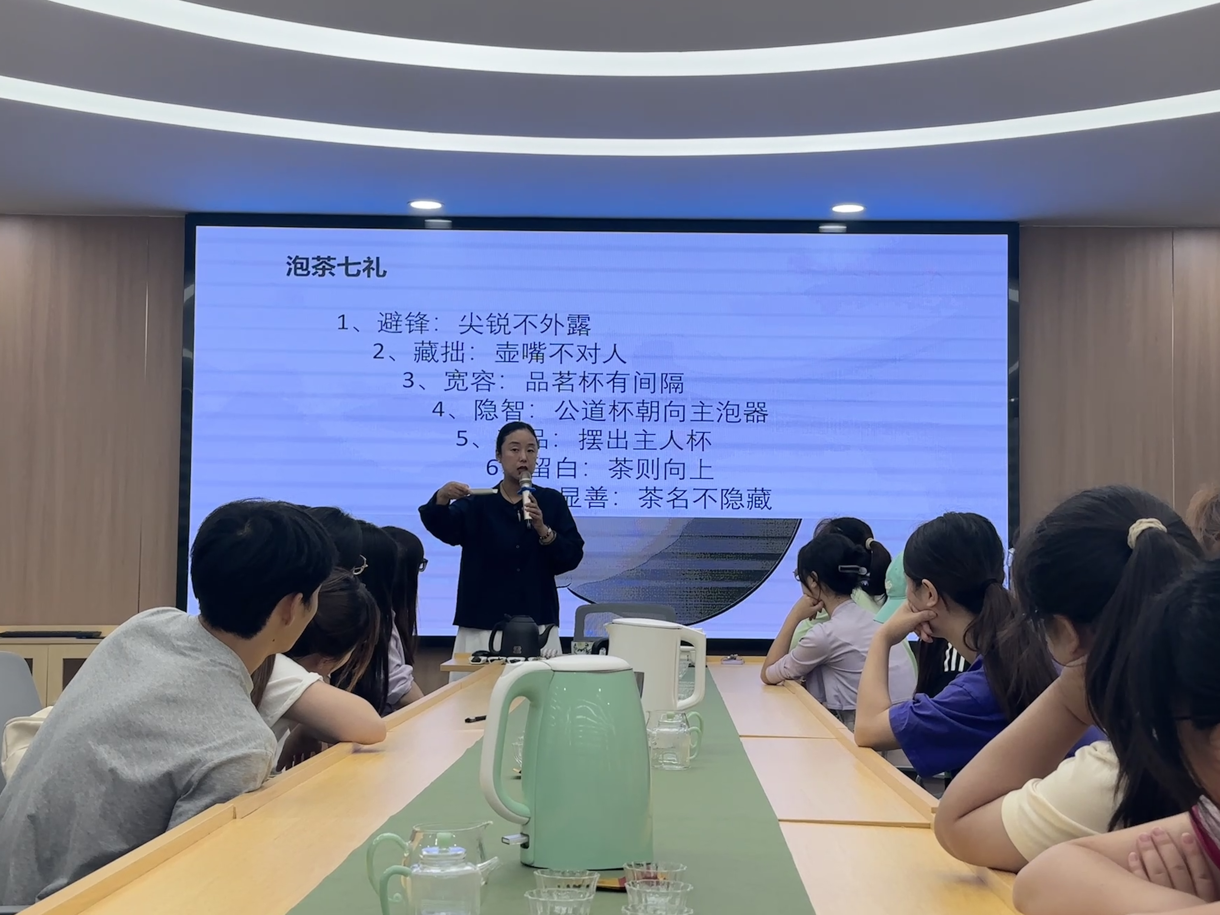 活动中,何珊从茶文化“和、敬、清、寂”的核心精神切入,系统讲解茶叶历史溯源、品类辨识等知识,特别阐释了茶文化与廉政文化的深层关联。从陆羽《茶经》倡导“精行俭德”的茶人修养,到宋代“茶宴论道”中“以茶示廉”的文人传统,再到当代“茶廉同源”的价值共识——茶性本清。同学们通过温杯洁具、分茶奉茶等流程体验,直观感受传统礼仪所蕴含的“清廉自守、光明磊落”品格。