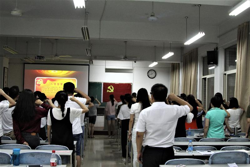 宣誓活动由学院党委副书记赵玎玎主持,学院党委书记周忠社领誓。近百名党员面向党旗庄严肃立,预备党员立于会场前排。全体师生党员面对鲜红的党旗,庄严地举起右拳,一起宣誓:“我宣誓:我志愿加入中国共产党……”铿锵有力的誓言响彻会场,宣誓活动现场更加庄严隆重。正式党员重温入党誓词,预备党员入党宣誓后依次郑重报出宣誓人姓名。许下庄严的承诺。