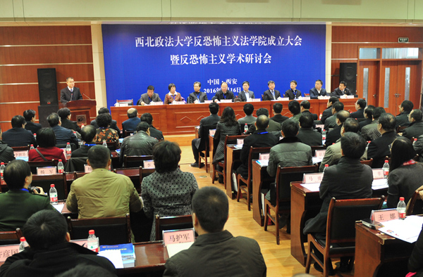 1月16日上午,西北政法大学反恐怖主义法学院成立大会暨反恐怖主义学术研讨会在长安校区图书馆一楼报告厅举行。来自中央政法委、最高人民法院、最高人民检察院、教育部、中国法学会、新疆维吾尔自治区党委政法委、陕西省委高教工委、陕西省教育厅等领导机关、实务部门及中国政法大学、西南政法大学、华东政法大学、中南财经政法大学、清华大学等国内高校的200多位专家学者参加了会议,并在随后举行的学术研讨会上围绕反恐怖主义问题展开研讨。