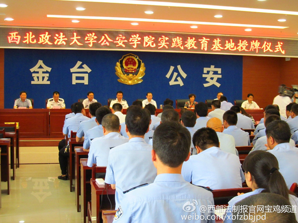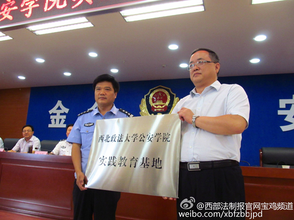 7月23日,西北政法大学公安学院实践教育基地授牌仪式在宝鸡市公安局金台分局举行,首批公安学院29名大三学生分赴公安一线开展实习锻炼,标志着双方的合作协议全面启动。宝鸡市委常委、政法委书记黄超,西北政法大学副校长、博士生导师郭捷出席授牌仪式并讲话,市委副秘书长王生辉,市政府党组成员、市公安局党委书记、局长张安新,金台区区长王建民出席授牌仪式。宝鸡市局党委委员、副局长陈双琪致辞,西北政法大学公安学院院长、司法鉴定中心主任程军伟与金台区政府副区长、公安分局党委书记、局长郭掌伟签署了合作协议。金台分局党委成员、科所队长、机关全体民警、西北政法大学公安学院实习生共100余人参加了授牌仪式。授牌仪式由金台区委常委、政法委书记罗科岐主持。