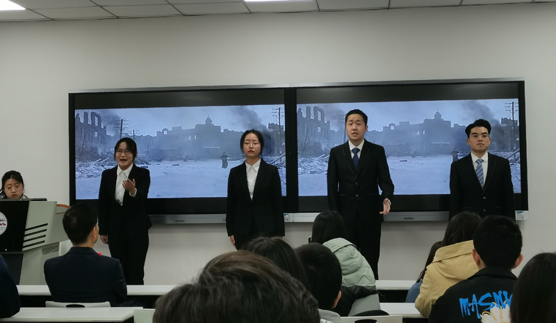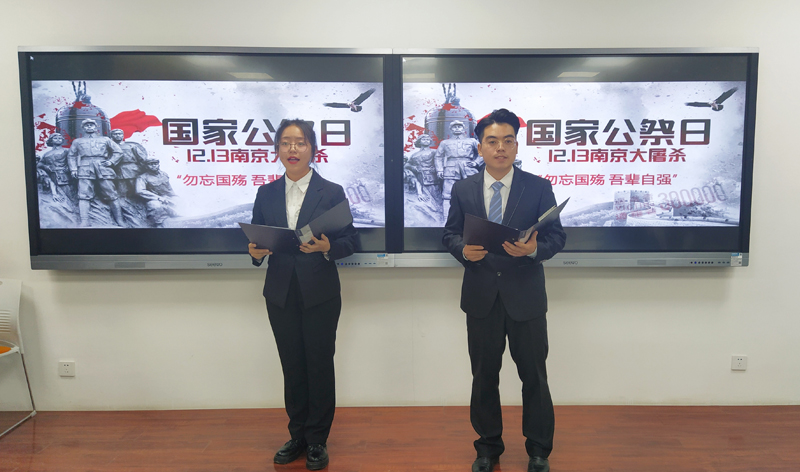 与会师生为南京30万遇难者和革命先烈默哀1分钟,集体观看了南京大屠杀相关影视资料,共同缅怀革命先烈。李超然、 薛璐宇、温智天、元智凯同学带来诗朗诵《雪落在中国的土地上》。