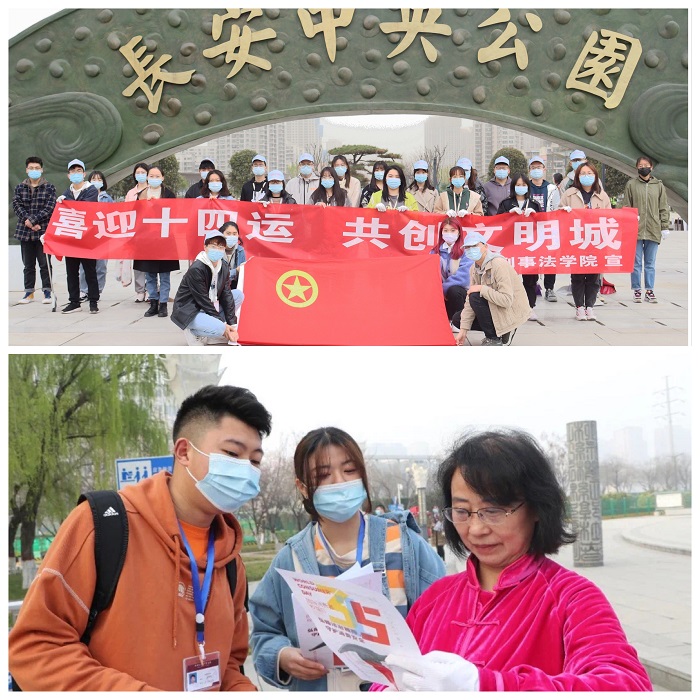 刑事法学院组织青年学生开展助力十四运会志愿服务活动,志愿者在长安公园展开志愿清扫活动,宣传志愿服务精神;外国语学院积极开展“斗力频催鼓,争都更上筹——助力十四运之志愿服务活动”,组织学生及家长参与公园竞走、普及科学健身知识、传播绿色运动理念,鼓励广大青年学生参与到十四运志愿者服务的队伍中,传递十四运知识,弘扬十四运精神;校学生会在长安区樱花广场开展“3·15国际消费者权益日“普法活动,加强消费者权益的宣传,帮助广大群众提高消费维权意识。