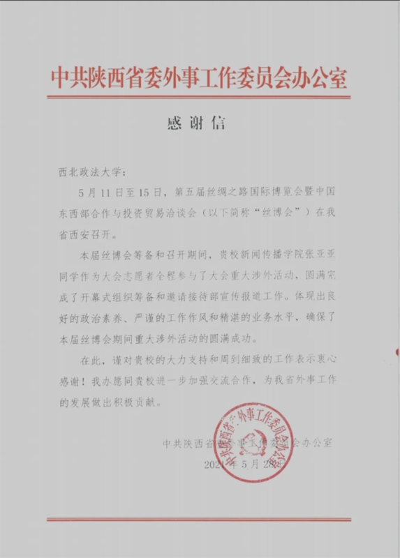 近日,中共陕西省委外事工作委员会办公室向我校发来感谢信,对我校大力支持和周到细致的工作表示感谢。