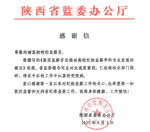 日前,陕西省监察委员会办公厅致函陕西省监察委员会特约监察员、我校行政法学院(纪检监察学院)褚宸舸教授,对其提交的内参《落实监察官法推动高校纪检监察学科专业发展的建议》表示感谢。该建议受到陕西省监察委员会的重视,经省监委领导同志批转相关部门阅研,在今后相关工作中吸纳。