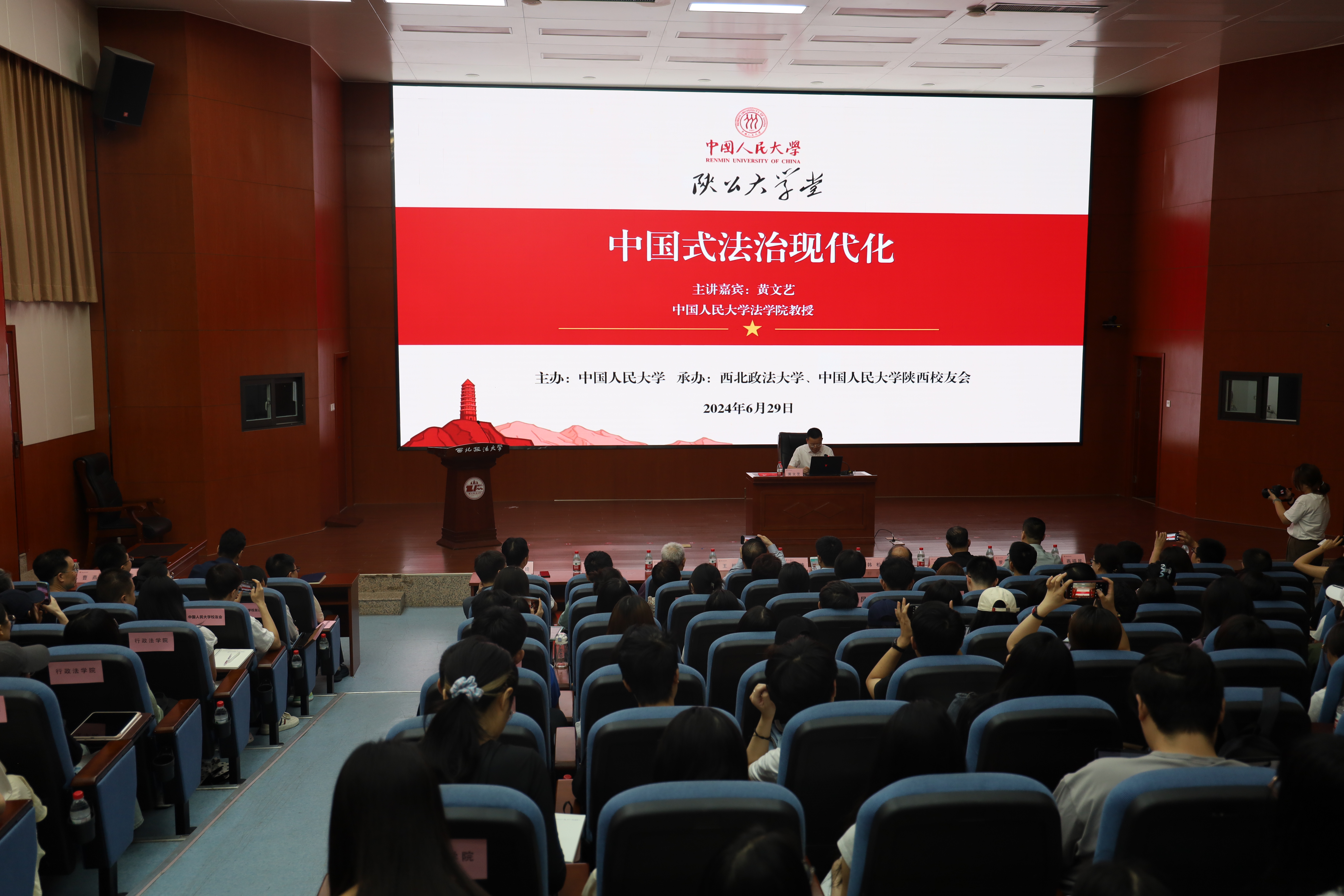 6月29日,中国人民大学“陕公大学堂”和我校“习近平法治思想大讲堂”在我校雁塔校区人权研究院报告厅开讲。中国人民大学法学院院长、《中国法学》总编辑黄文艺教授以《中国式法治现代化》为主题,为广大师生校友带来了一场精彩纷呈的思想盛宴。中国人民大学陕西校友会会长党瑞,陕西省委宣传部理论处处长、省社科工作办主任高宝荣出席。我校副校长马朝琦主持会议。
