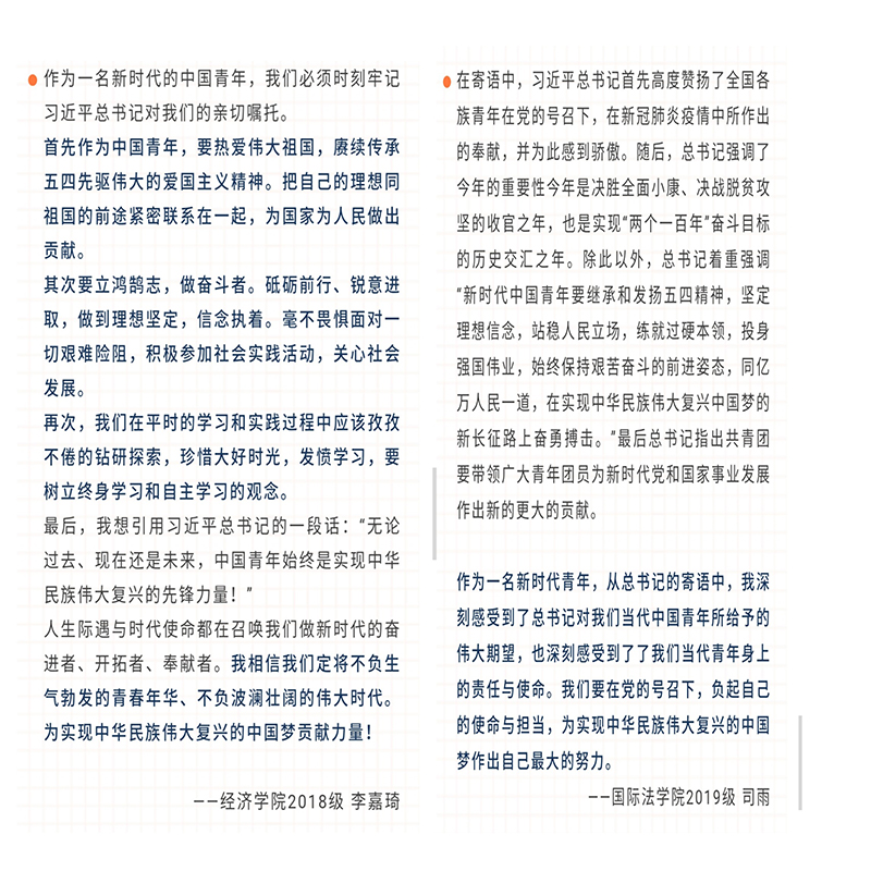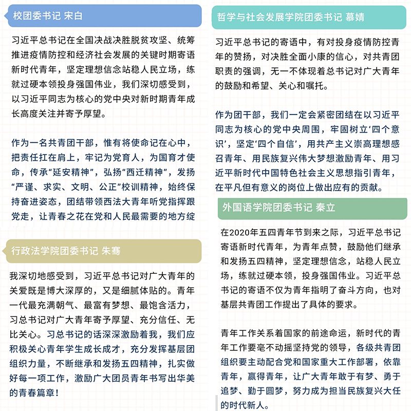 五四青年节前夕,习近平总书记发表寄语向全国各族青年致以节日的祝贺和诚挚的问候,在西法大青年师生中引发热议。团干部、团员青年从习近平总书记的五四青年节寄语中充分感受到了习近平总书记的亲切关怀和深切勉励,纷纷发表感言,表示在今后的工作学习中,把使命记在心中,把责任扛在肩上,在担当中历练,在磨砺中成长。