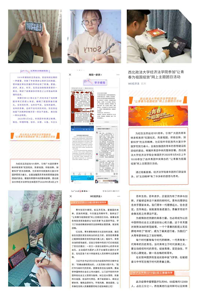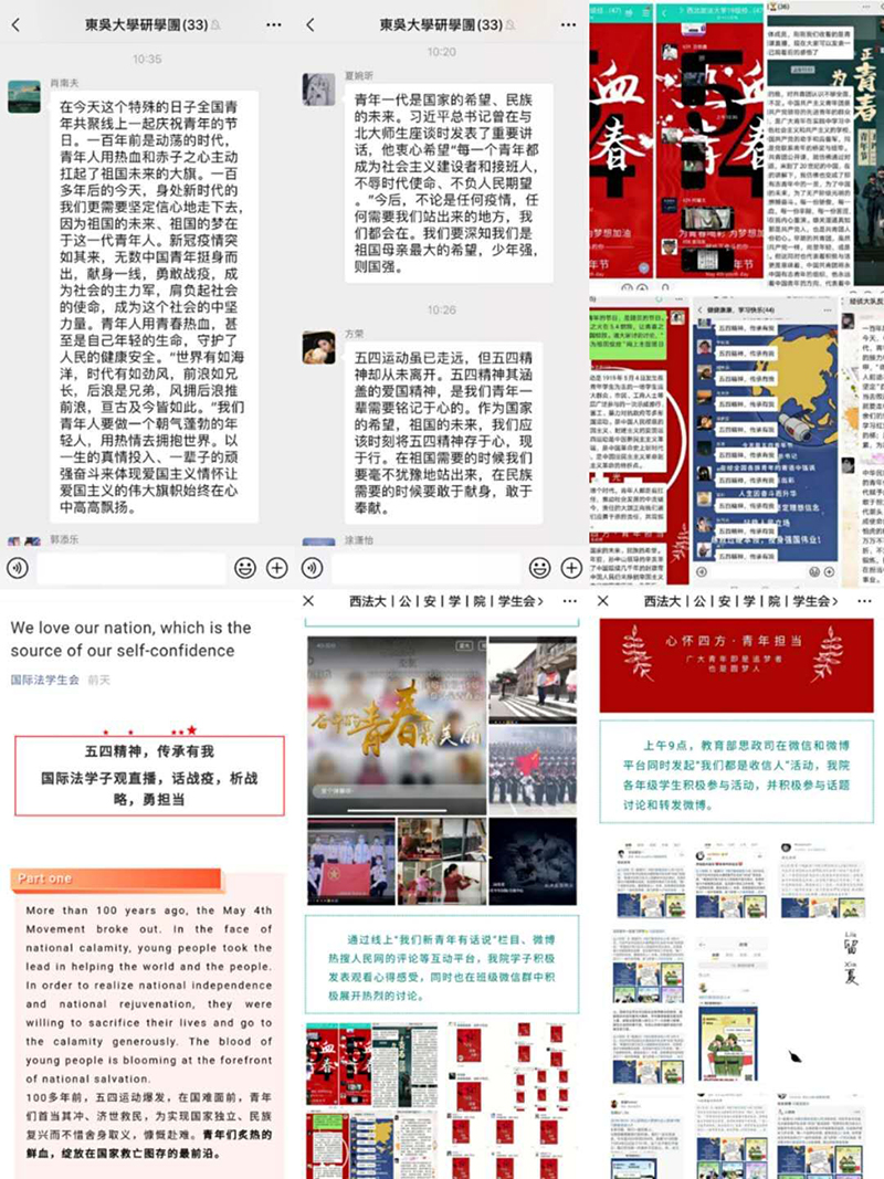 5月4日当天,在共青团中央举办的 “让青春为祖国绽放”网上主题团日活动中,我校青年通过线上直播以及微博互动的形式,积极参与、踊跃互动,掀起了庆祝五四青年节的高潮。同学们从网络主题团日直播中,进一步了解了新时代五四精神的内涵,也看到了新时代青年在抗疫中的无私付出、勇敢无畏、责任担当,纷纷表示要勇挑时代重担,践行五四精神,传承红色基因,不惧风雨挑战。