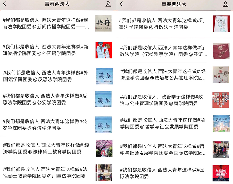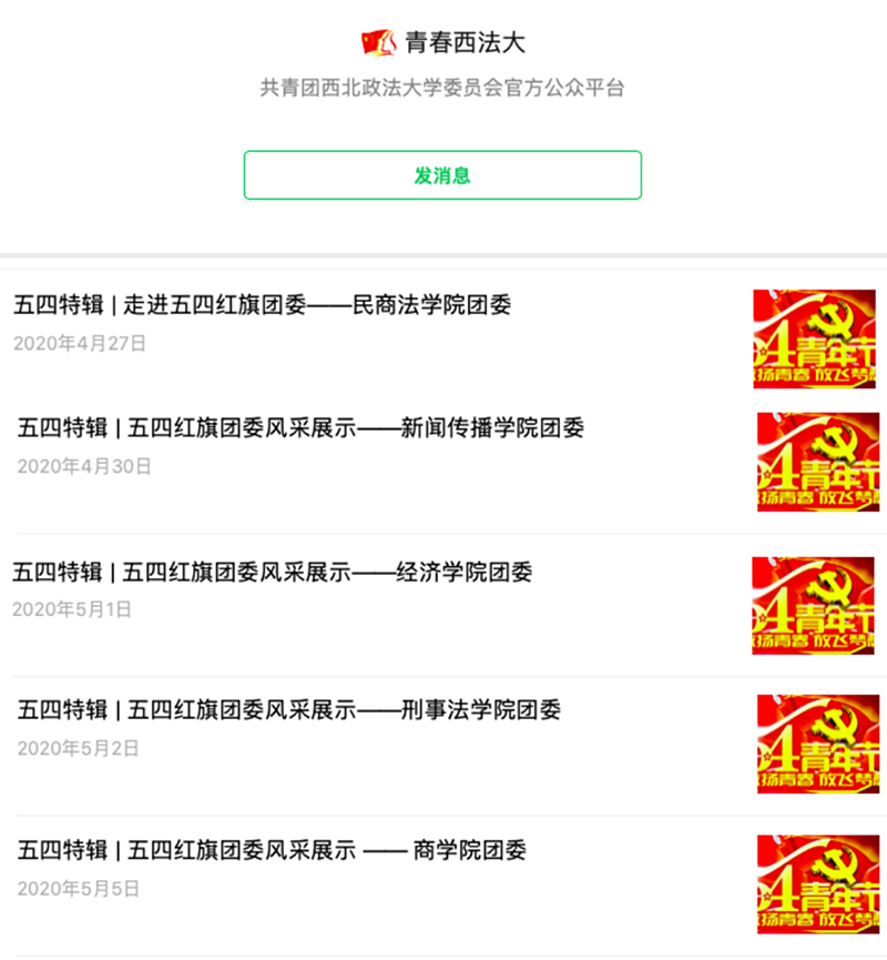 五四期间,我校团委扎实开展了2019—2020年度五四表彰评选工作。召开共青团工作交流会,评选2019—2020年度五四红旗团委,依托“青春西法大”等各级团属媒体,进行“五四红旗团委风采展示”网络宣传;并深入挖掘在阻击新冠肺炎疫情战斗中表现突出的青年团员,评选“抗疫优秀青年志愿者”,激励广大青年见贤思齐,发挥榜样的示范带动作用。