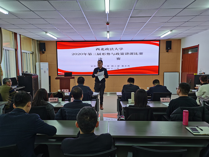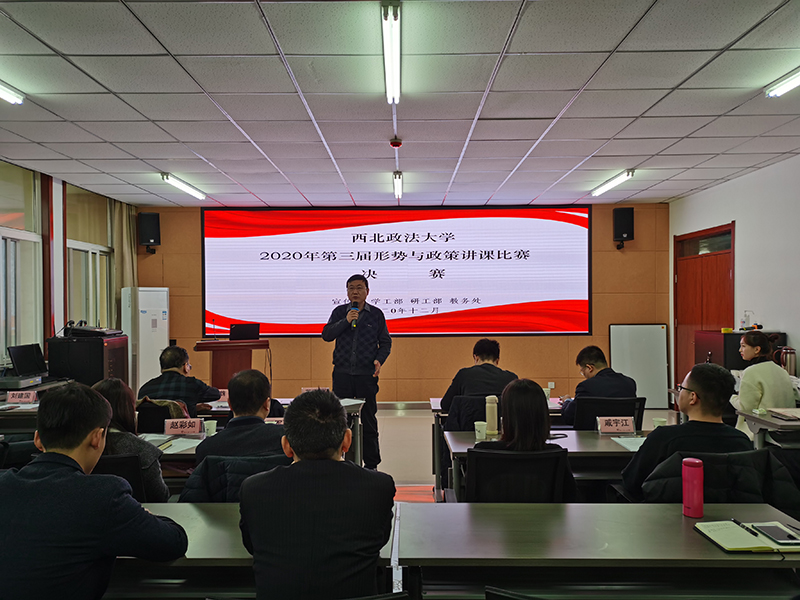 12月29日下午,我校第三届“形势与政策”讲课比赛决赛在长安校区举行。校党委副书记郭武军,马克思主义学院院长魏奇、宣传部部长戴鲲、学工部部长燕福民、研工部副部长赵彩如、教务处副处长何玉军、马克思主义学院教师刘建国,国际法学院2017级本科生任奕霖,政治与公共管理学院2017级本科生戚宇江等担任比赛评委,全体学工干部现场观摩了比赛。
