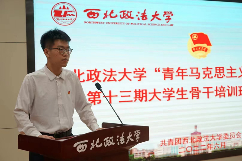 第十三期大学生骨干培训班学员代表、民商法学院2020级弥泽昊同学向学员们发出倡议,倡议同学们珍惜本次学习机会,以饱满的热情和昂扬的精神投入到未来的学习和实践中,努力拼搏、奋勇争先,为党和国家事业发展贡献青春力量。