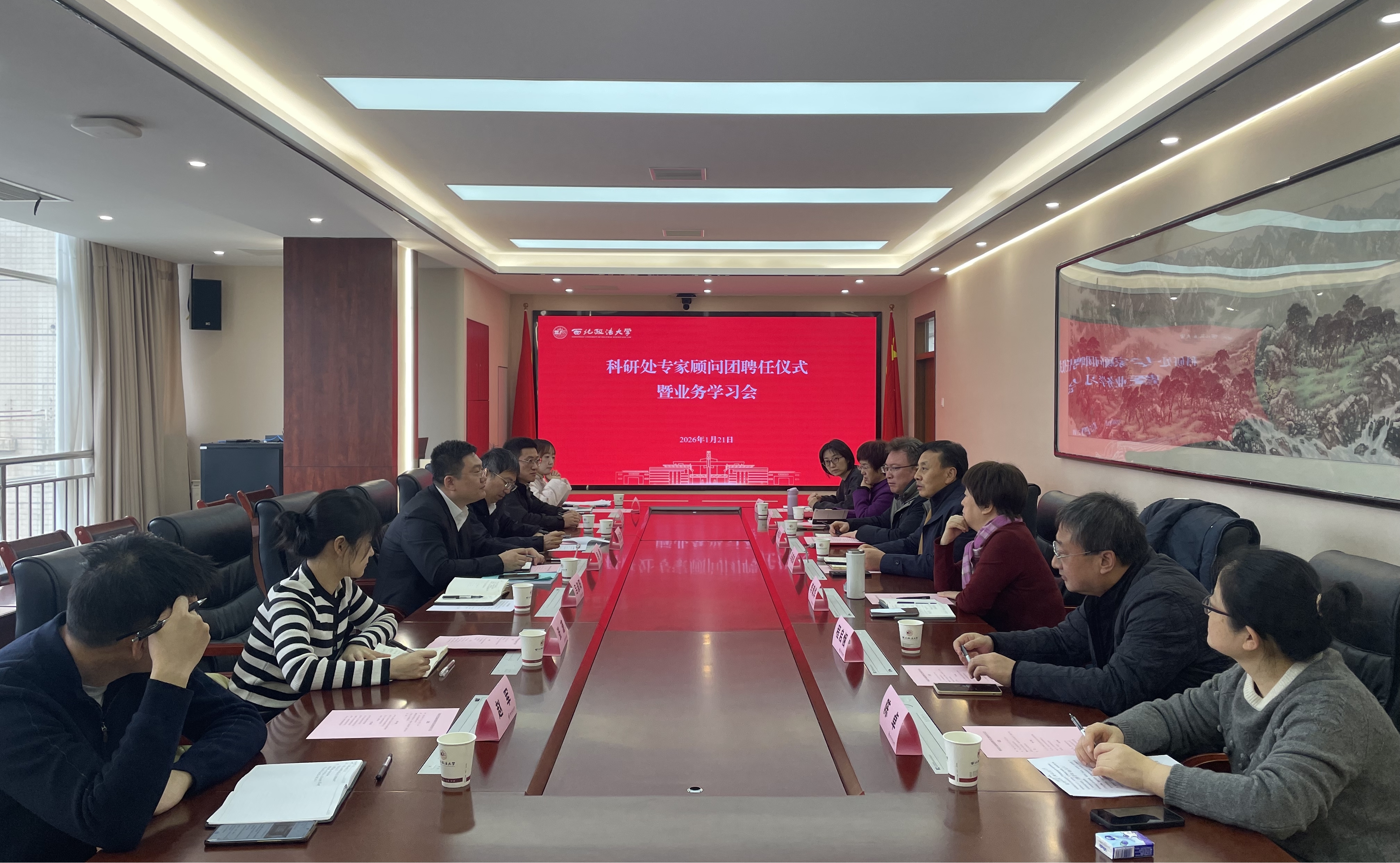 1月21日下午,科研处在长安校区举行专家顾问团聘任仪式暨2026年第一期业务学习会,副校长马朝琦出席仪式并讲话,受邀专家顾问及科研处全体干部参加会议。