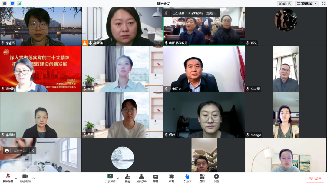 山阳县科教局党委副书记冯爱铭在讲话中介绍了山阳教育发展的现状,及“双百工程”实施以来,西北政法大学倾力助推山阳脱贫攻坚、乡村振兴的有力举措。他认为哲社学院举办的“线上座谈会”是给山阳教育传经送宝的有效途径,开辟了“双百工程”帮扶新途径。希望未来能与哲社学院有更多的合作,助力山阳做好巩固拓展脱贫攻坚成果同乡村振兴有效衔接工作。