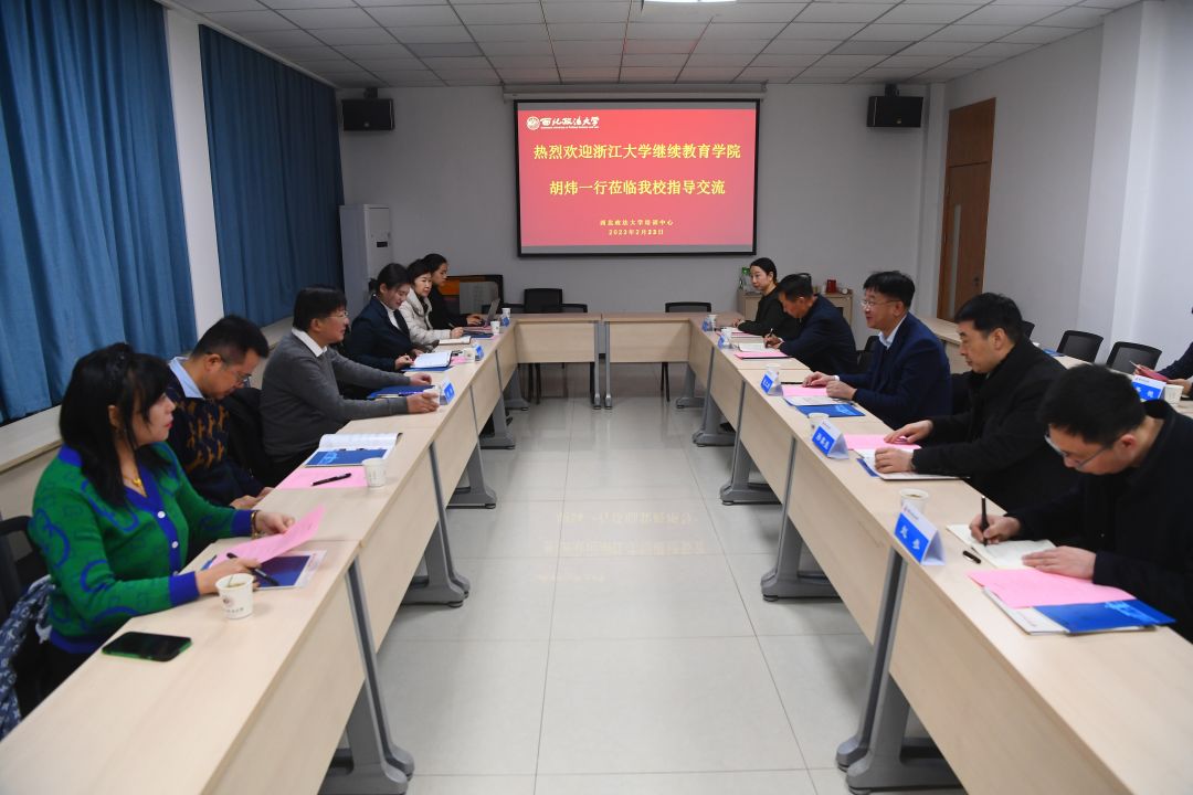2月23日,全国干部教育培训浙江大学基地常务副主任、继续教育学院党委书记胡炜一行6人来我校调研。校党委副书记、校长范九利,副校长孙昊亮出席座谈会。我校培训中心主任李集合、浙江大学西北区培训部负责人、浙江大学校友会西安分会会长参加座谈。