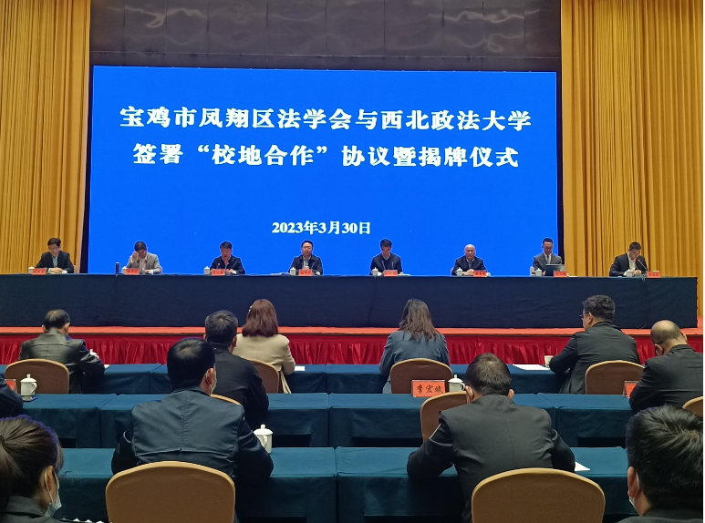 3月30日上午,我校与宝鸡市凤翔区法学会“校地共建”合作签约仪式隆重举行。宝鸡市委常委、政法委书记赵甲宏,凤翔区委书记王宏强,我校副校长张军政出席并致辞。陕西省法学会秘书长樊志来到会指导,凤翔区司法机关代表和我校代表共计100余人参加。凤翔区委常委、政法委书记郭亚波主持会议。