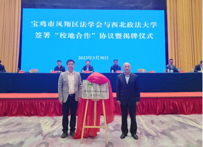 樊志来与我校刑事法学院党委书记孙学龙共同为法治凤翔与社会治理研究中心揭牌。